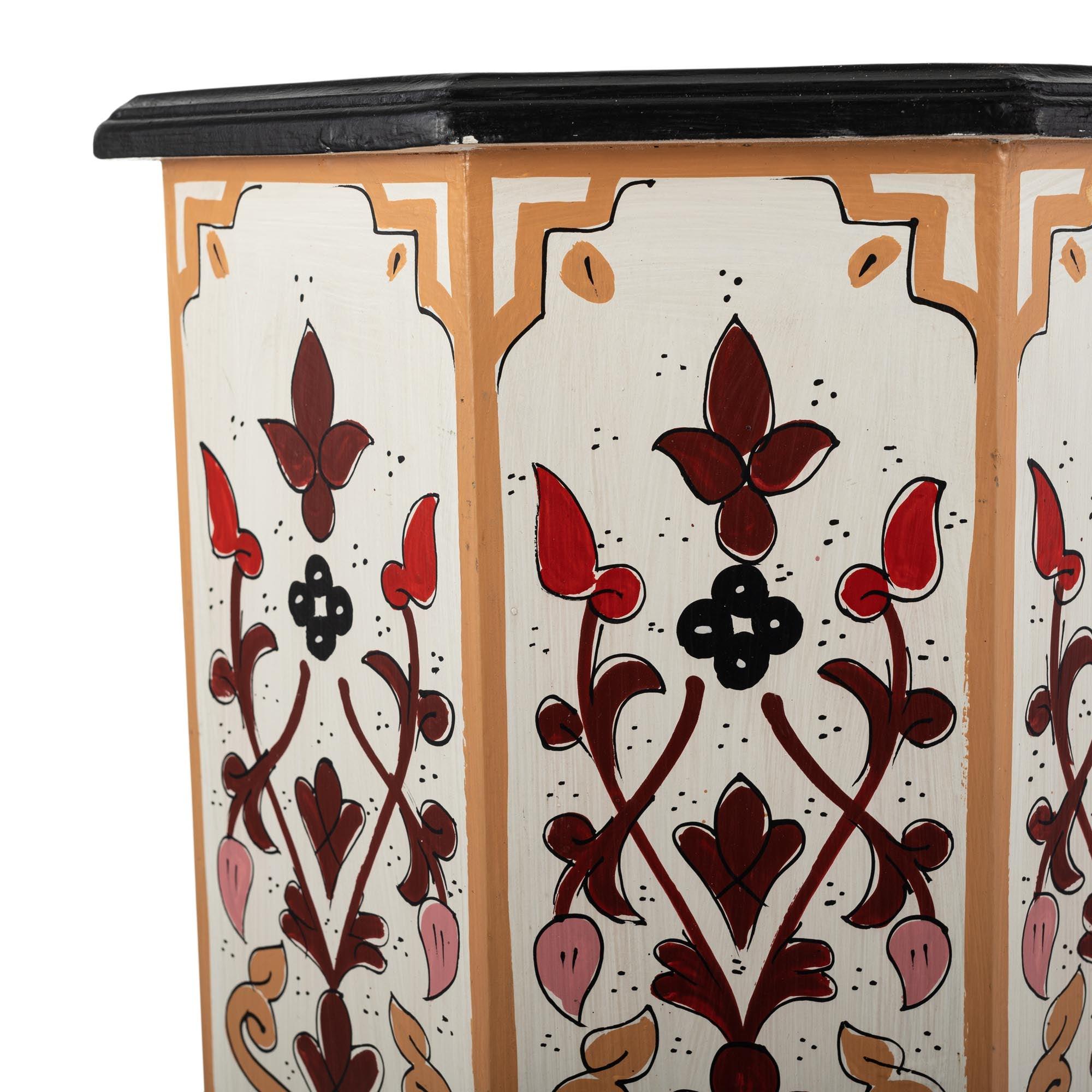 Marokkaanse houten tafel, handgeschilderd, overwegend wit, met een achthoekige vorm en vrolijke bloemmotieven, evenals geometrische vormen. die de architectuur van Al-Andalus oproepen.