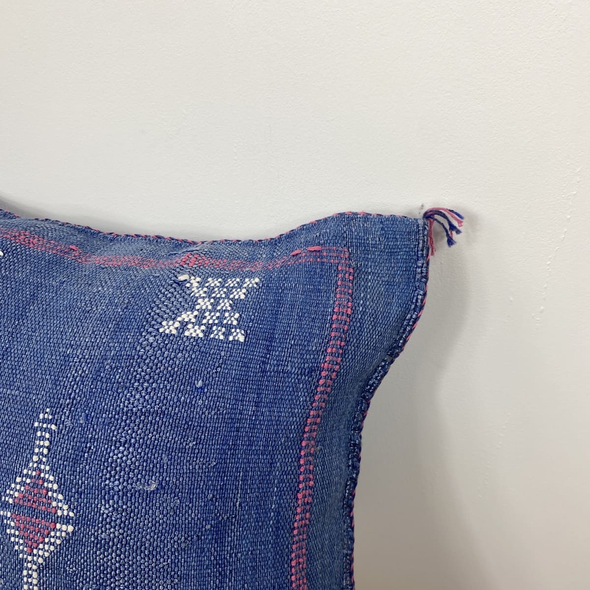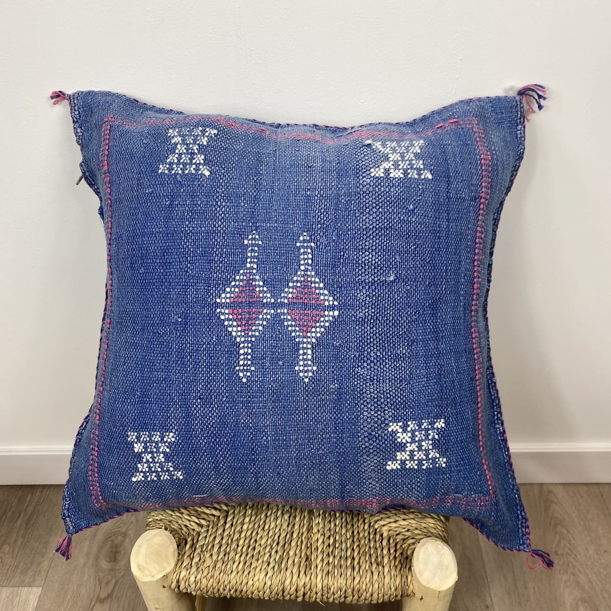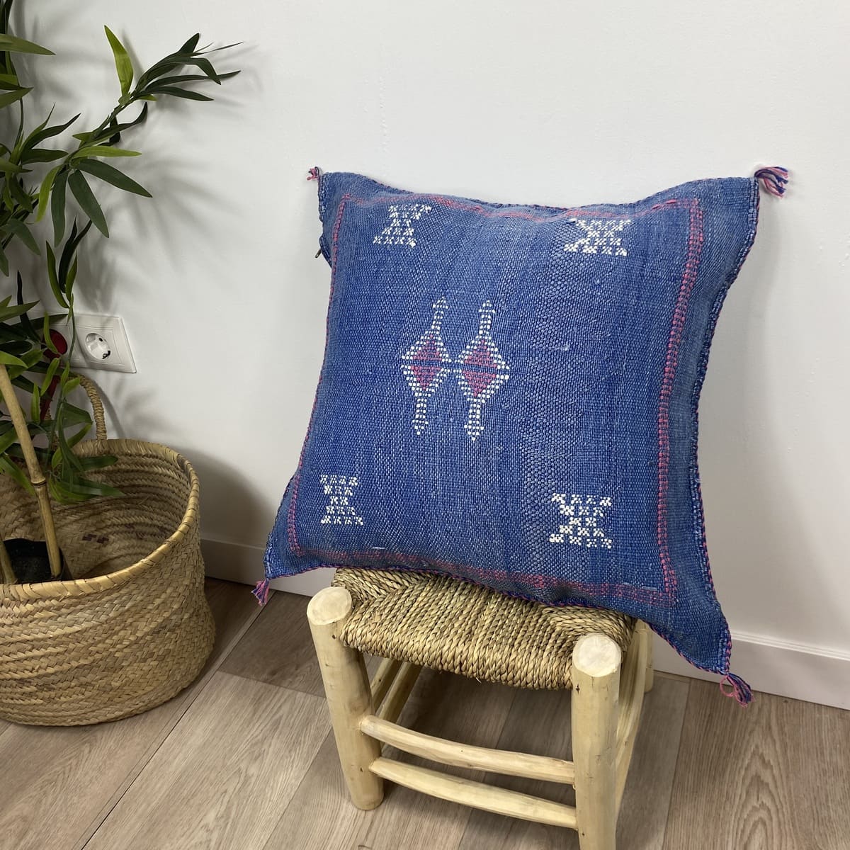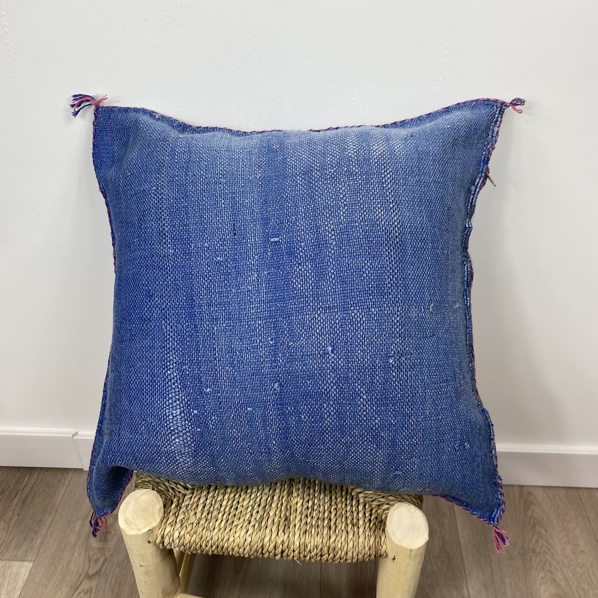 Wij presenteren deBlauw cactus zijden kussen, Een toonbeeld van Marokkaans vakmanschap, waarin de diepte van traditioneel blauw gecombineerd wordt met de uitmuntende textielkunst van de Berbers. Dit kussen van 50x50 cm is gemaakt van natuurlijke cactusvezels (sabra) en met de hand geverfd met natuurlijke pigmenten. Het vertegenwoordigt het meesterschap van de ververs uit het Atlasgebergte.