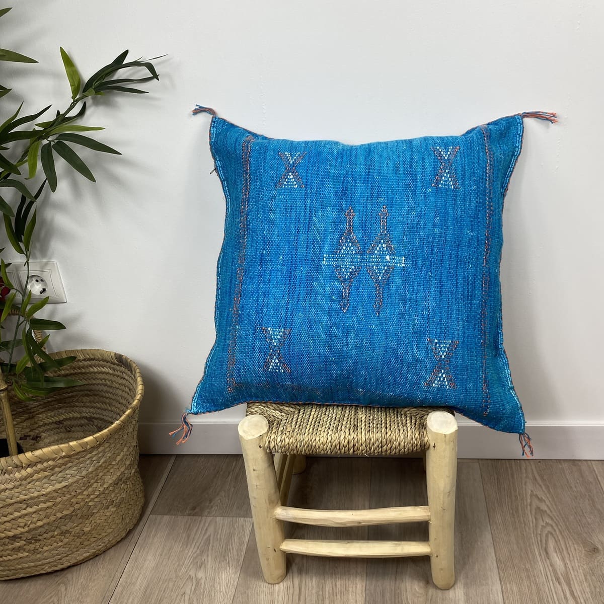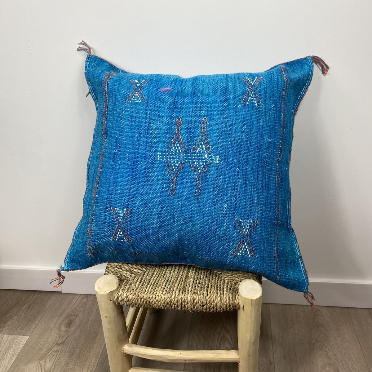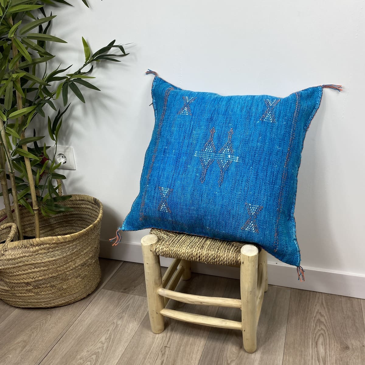 Wij presenteren deOceaanblauwe zijden kussen met cactusmotief, Een handgemaakt stuk dat de essentie van de Marokkaanse Middellandse Zee vastlegt. Gemaakt van natuurlijke cactusvezels (sabra) en met de hand geverfd met minerale pigmenten, biedt dit kussen van 50x50 cm een intense blauwe kleur met nuances die de diepe wateren van de Atlantische Oceaan oproepen.