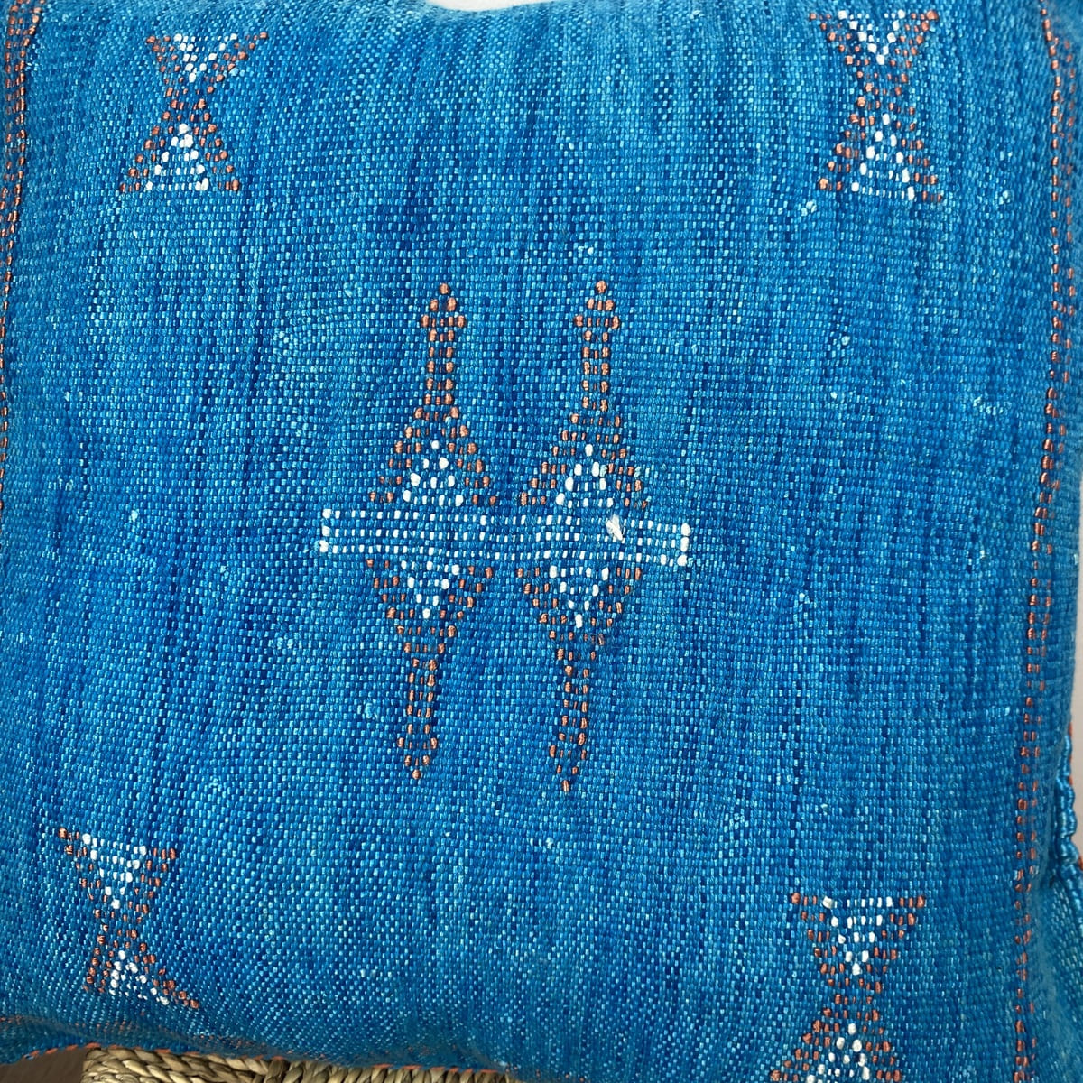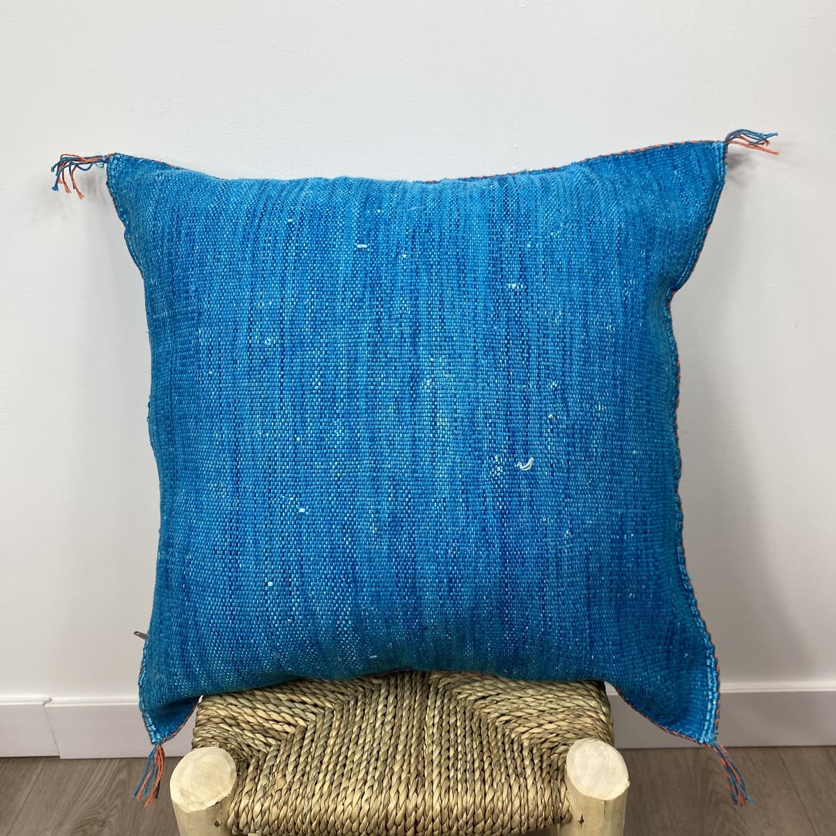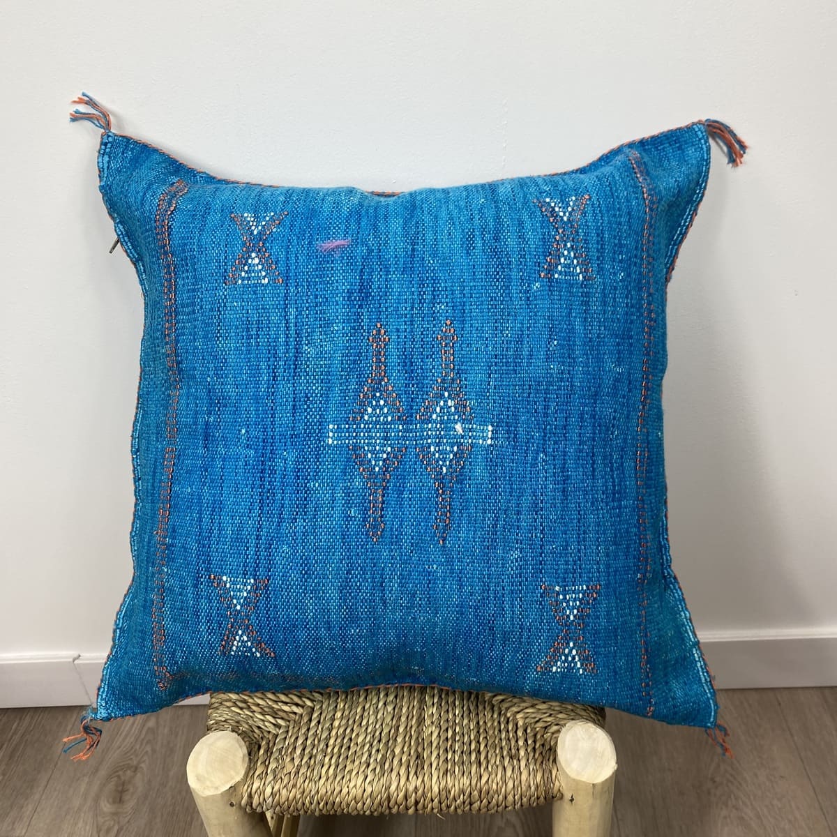 Wij presenteren deOceaanblauwe zijden kussen met cactusmotief, Een handgemaakt stuk dat de essentie van de Marokkaanse Middellandse Zee vastlegt. Gemaakt van natuurlijke cactusvezels (sabra) en met de hand geverfd met minerale pigmenten, biedt dit kussen van 50x50 cm een intense blauwe kleur met nuances die de diepe wateren van de Atlantische Oceaan oproepen.