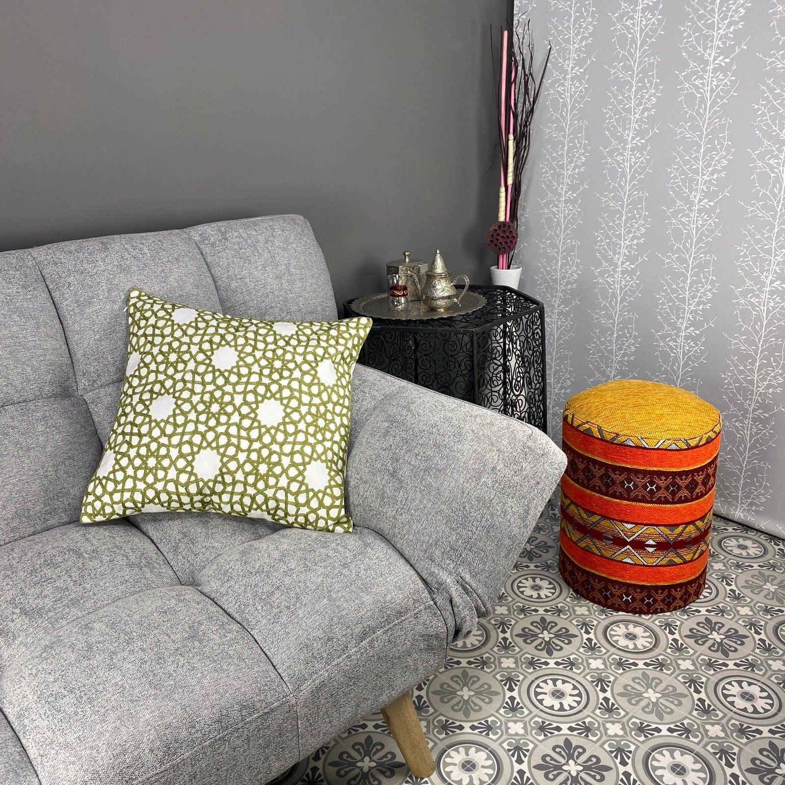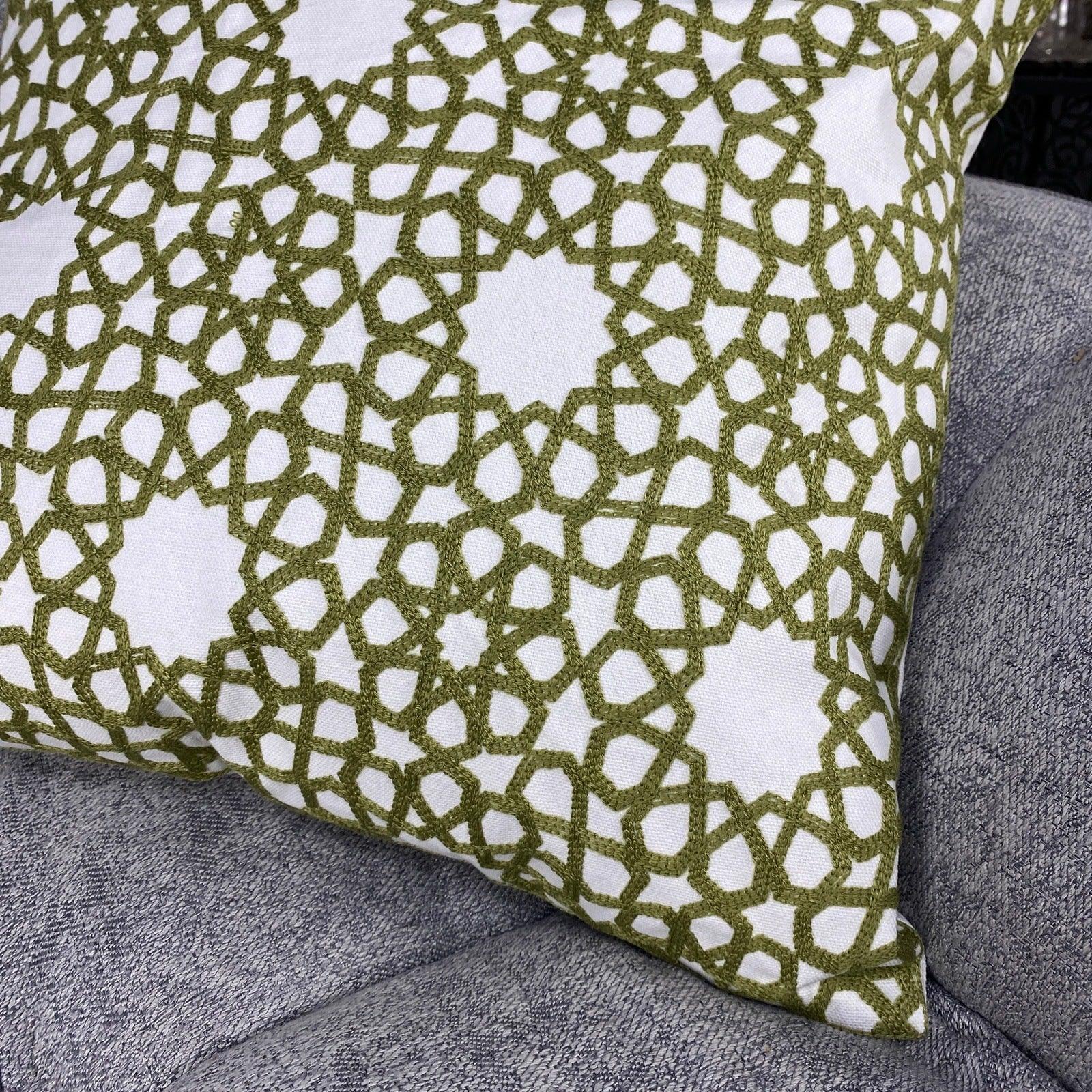 Handgemaakte Arabische kussenhoes met sterrenmotief in pistachekleur, 100% handgemaakt. Breng een oosterse Arabische sfeer in uw woonkamer of slaapkamer met deze elegante en moderne Arabische kussens. Slechts een zeer beperkt aantal beschikbaar, waardoor ze uniek en exclusief zijn. Bestel de uwe nu!