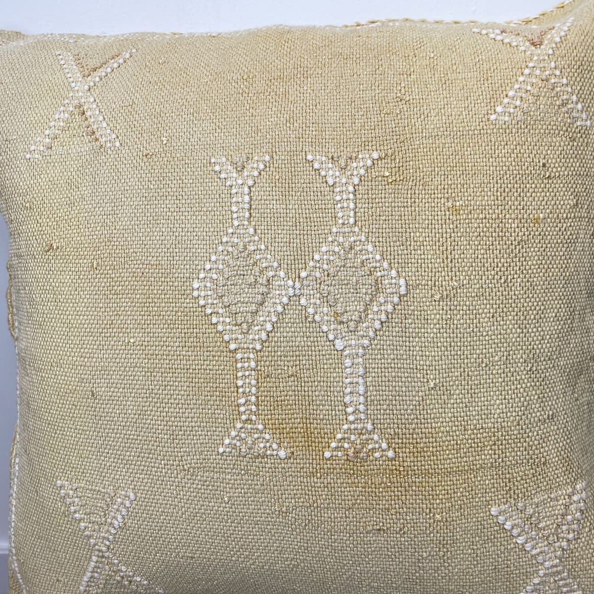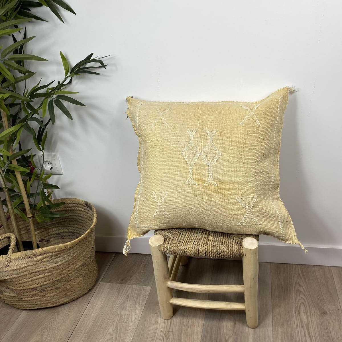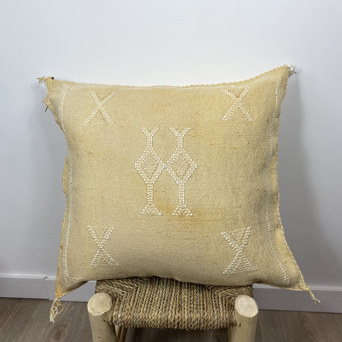 Wij presenteren deVintage zijden kussen met gele cactus, Een handgemaakt stuk dat de Marokkaanse textieltraditie herinterpreteert met een verfijnde, nostalgische en verweerde afwerking. Gemaakt van natuurlijke cactusvezels (sabra) en met de hand geverfd volgens eeuwenoude technieken, biedt dit kussen van 50x50 cm een gedempte gele kleur met een unieke tintdiepte.