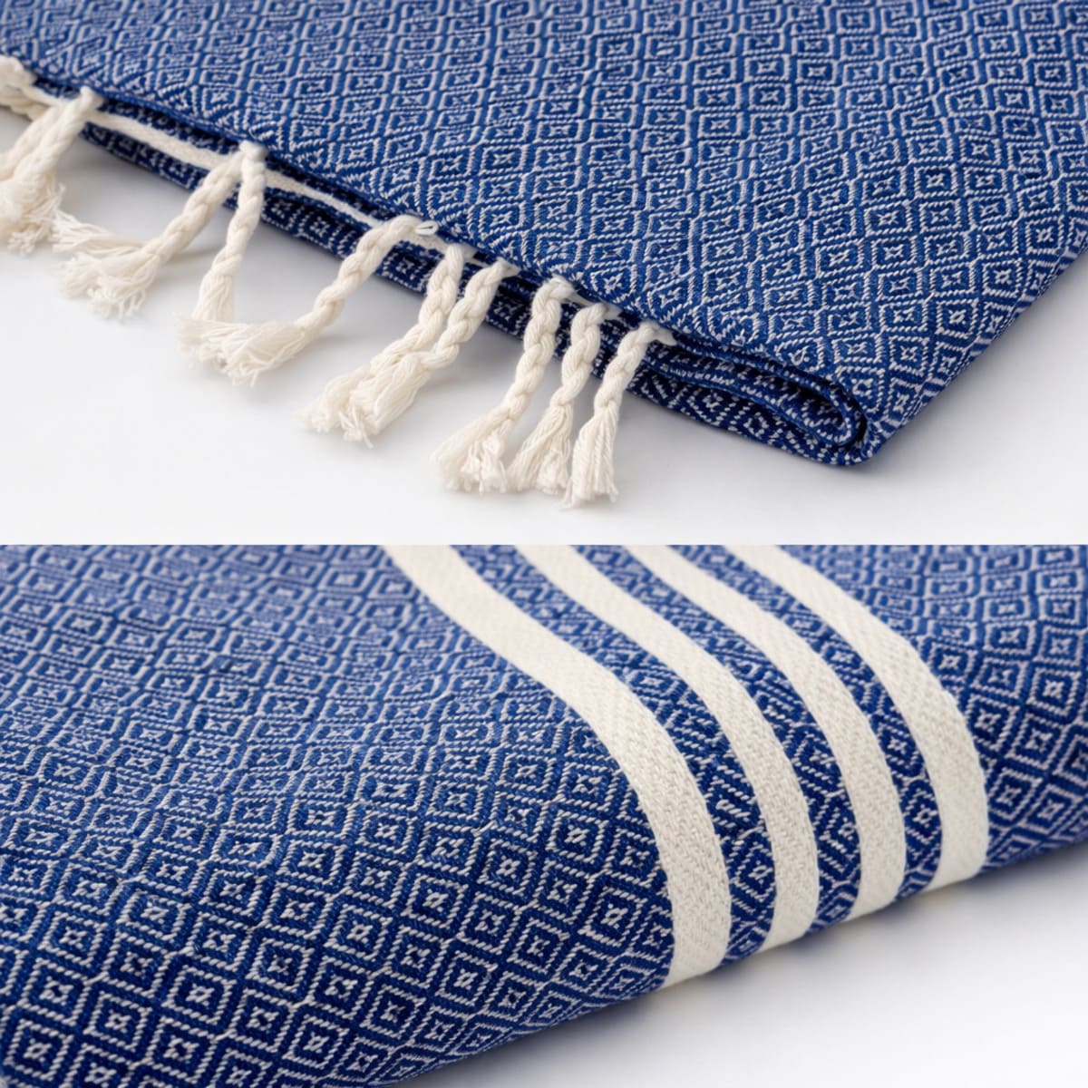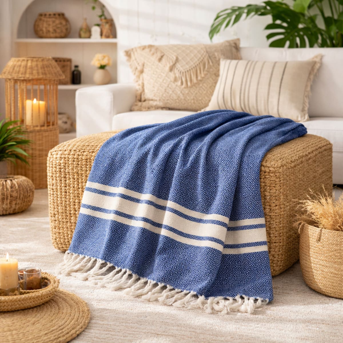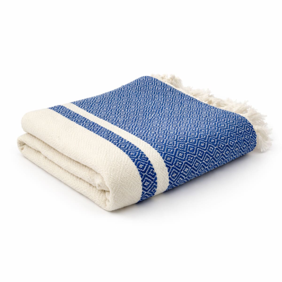 Handgemaakte Marrakech sprei in blauw en wit. Met ruitvormige motieven en decoratieve franjes. Ideaal voor op de bank of het bed.
